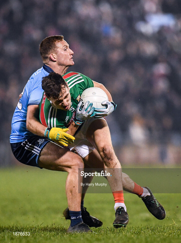 1 February 2020; Michael Plunkett of Mayo in action against Ciarán Kilkenny of Dublin during the Allianz Football League Division 1 Round 2 match between Mayo and Dublin at Elverys MacHale Park in Castlebar, Mayo. Photo by Harry Murphy/Sportsfile