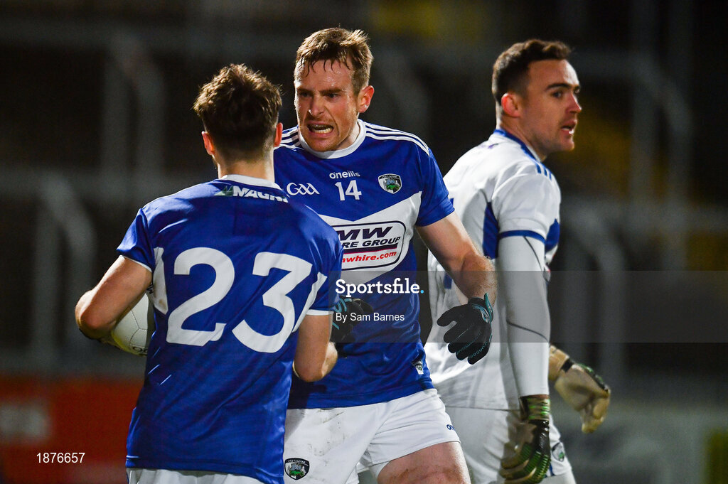1 February 2020; Kieran Lillis, centre, and Darragh Connolly of Laois celebrate following the Allianz Football League Division 2 Round 2 match between Laois and Armagh at MW Hire O'Moore Park in Portlaoise, Laois. Photo by Sam Barnes/Sportsfile