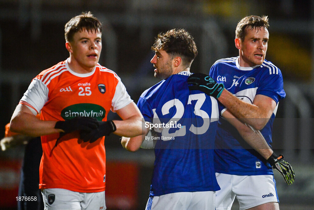 1 February 2020; Kieran Lillis, right, and Darragh Connolly of Laois celebrate as Paul Hughes of Armagh leaves the field following the Allianz Football League Division 2 Round 2 match between Laois and Armagh at MW Hire O'Moore Park in Portlaoise, Laois. Photo by Sam Barnes/Sportsfile