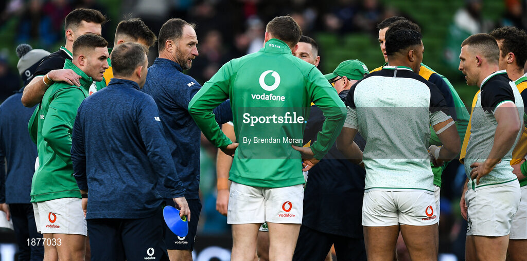 1 February 2020; Assistant coach Mike Catt speaks to the players prior to the Guinness Six Nations Rugby Championship match between Ireland and Scotland at the Aviva Stadium in Dublin. Photo by Brendan Moran/Sportsfile