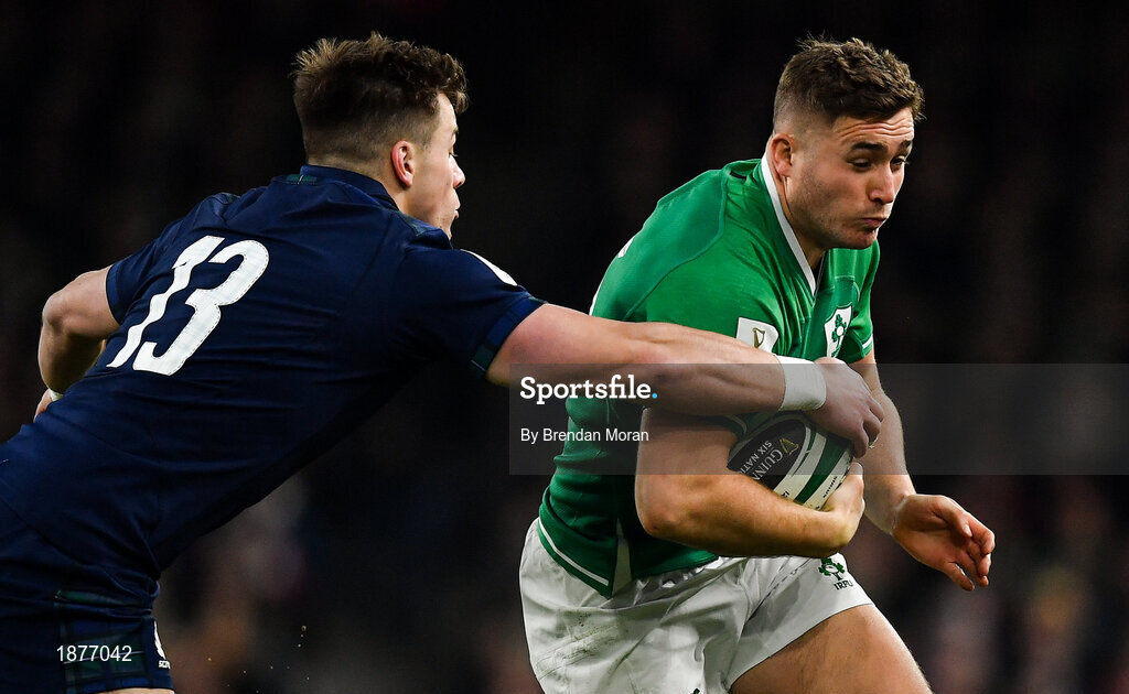 1 February 2020; Jordan Larmour of Ireland is tackled by Huw Jones of Scotland during the Guinness Six Nations Rugby Championship match between Ireland and Scotland at the Aviva Stadium in Dublin. Photo by Brendan Moran/Sportsfile