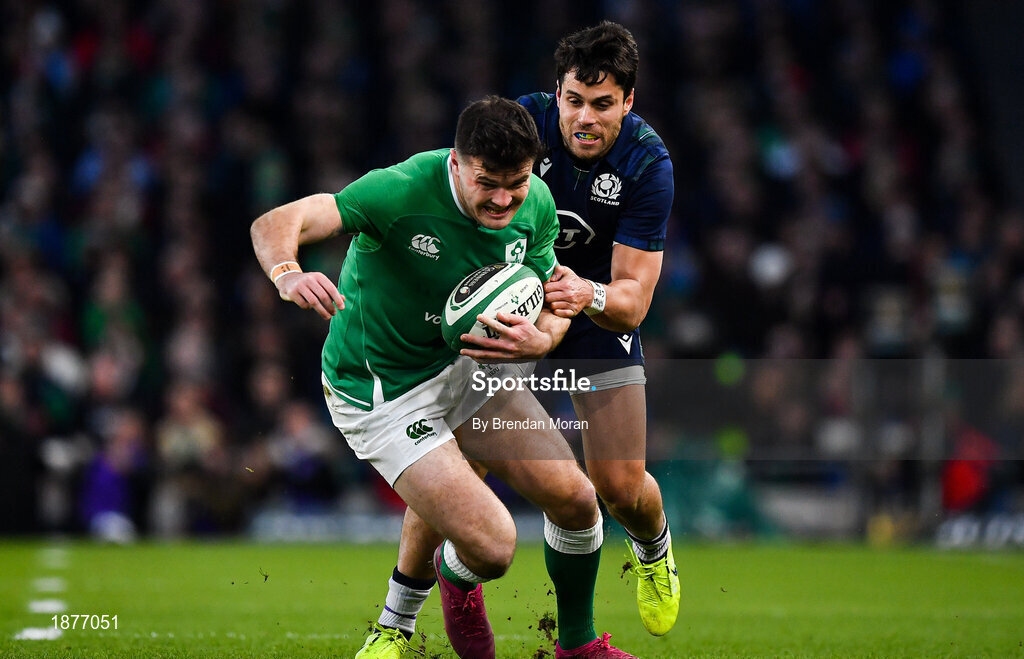 1 February 2020; Jacob Stockdale of Ireland is tackled by Sean Maitland of Scotland during the Guinness Six Nations Rugby Championship match between Ireland and Scotland at the Aviva Stadium in Dublin. Photo by Brendan Moran/Sportsfile