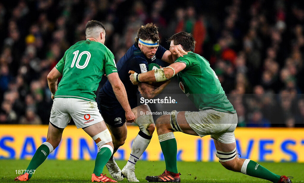 1 February 2020; Hamish Watson of Scotland is tackled by Jonathan Sexton and Iain Henderson of Ireland during the Guinness Six Nations Rugby Championship match between Ireland and Scotland at the Aviva Stadium in Dublin. Photo by Brendan Moran/Sportsfile