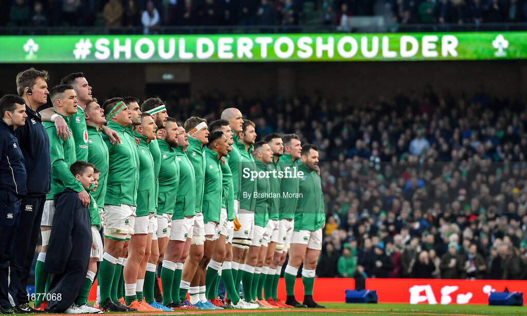 1 February 2020; The Ireland team stand for Amhrán na bhFiann prior to the Guinness Six Nations Rugby Championship match between Ireland and Scotland at the Aviva Stadium in Dublin. Photo by Brendan Moran/Sportsfile