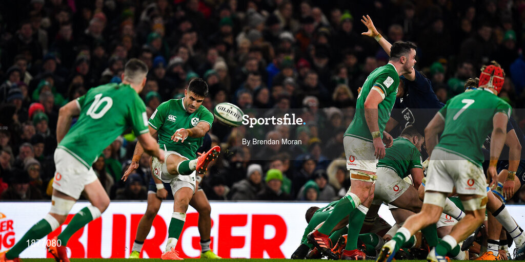 1 February 2020; Conor Murray of Ireland box kicks during the Guinness Six Nations Rugby Championship match between Ireland and Scotland at the Aviva Stadium in Dublin. Photo by Brendan Moran/Sportsfile