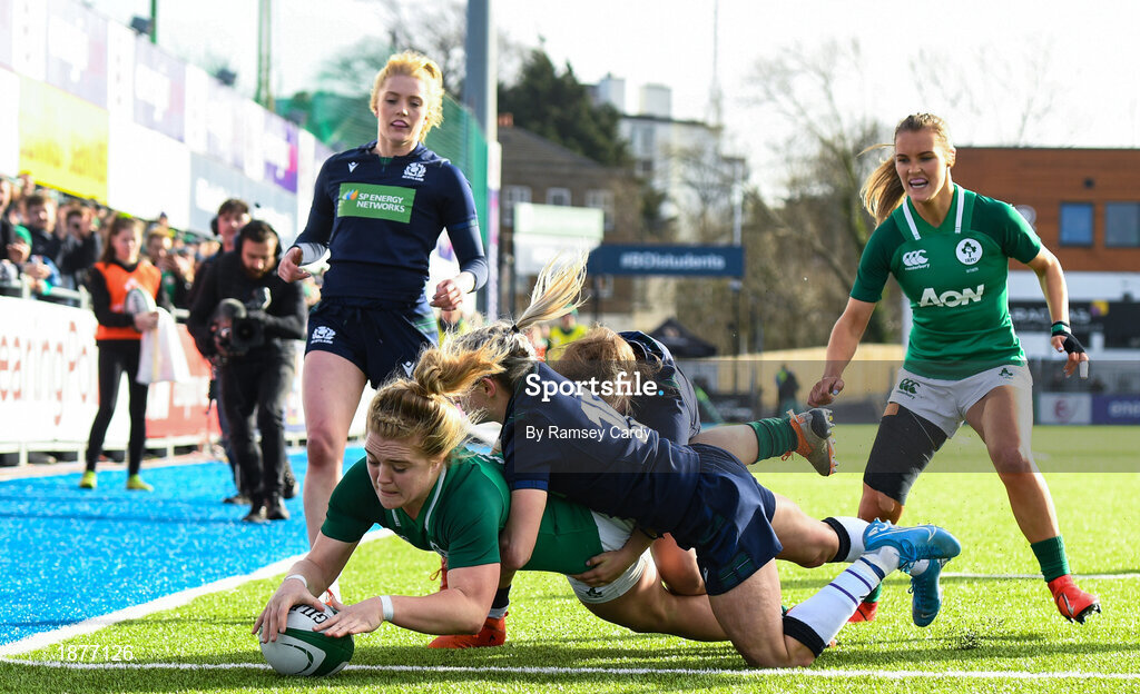 2 February 2020; Cliodhna Moloney of Ireland dives over to score her side's first try during the Women's Six Nations Rugby Championship match between Ireland and Scotland at Energia Park in Donnybrook, Dublin. Photo by Ramsey Cardy/Sportsfile