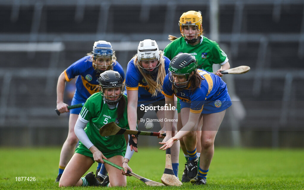 2 February 2020; Mairead Ryan of Limerick in action against Niamh Treacy and Roisin Howard of Tipperary during the Littlewoods Ireland National Camogie League Division 1 match between Limerick and Tipperary at LIT Gaelic Grounds in Limerick. Photo by Diarmuid Greene/Sportsfile