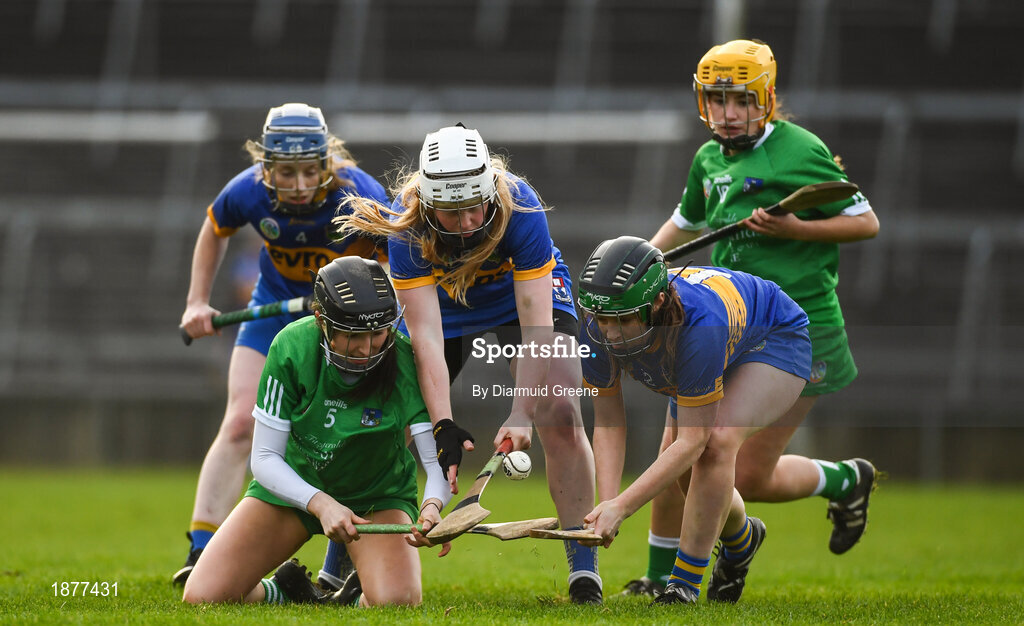 2 February 2020; Mairead Ryan of Limerick in action against Niamh Treacy and Roisin Howard of Tipperary during the Littlewoods Ireland National Camogie League Division 1 match between Limerick and Tipperary at LIT Gaelic Grounds in Limerick. Photo by Diarmuid Greene/Sportsfile