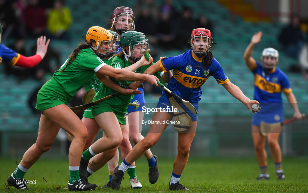 2 February 2020; Karin Blair of Tipperary in action against Noirin Lenihan and Muireann Creamer of Limerick during the Littlewoods Ireland National Camogie League Division 1 match between Limerick and Tipperary at LIT Gaelic Grounds in Limerick. Photo by Diarmuid Greene/Sportsfile