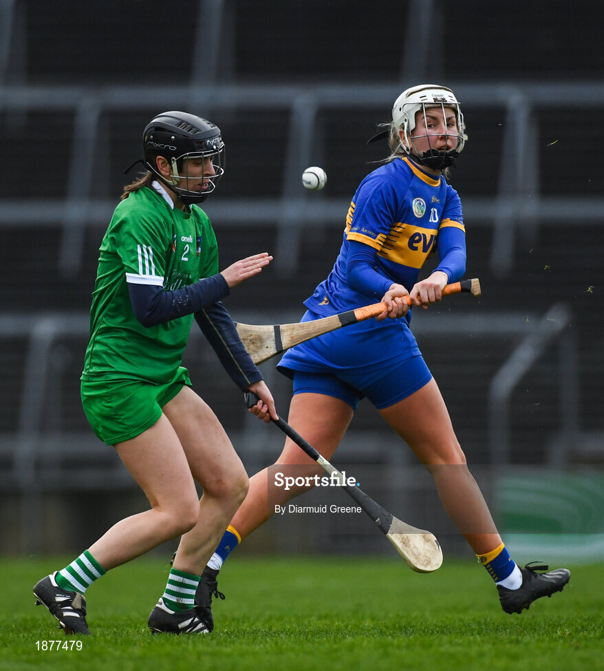 2 February 2020; Nicole Walsh of Tipperary in action against Judith Mulcahy of Limerick during the Littlewoods Ireland National Camogie League Division 1 match between Limerick and Tipperary at LIT Gaelic Grounds in Limerick. Photo by Diarmuid Greene/Sportsfile