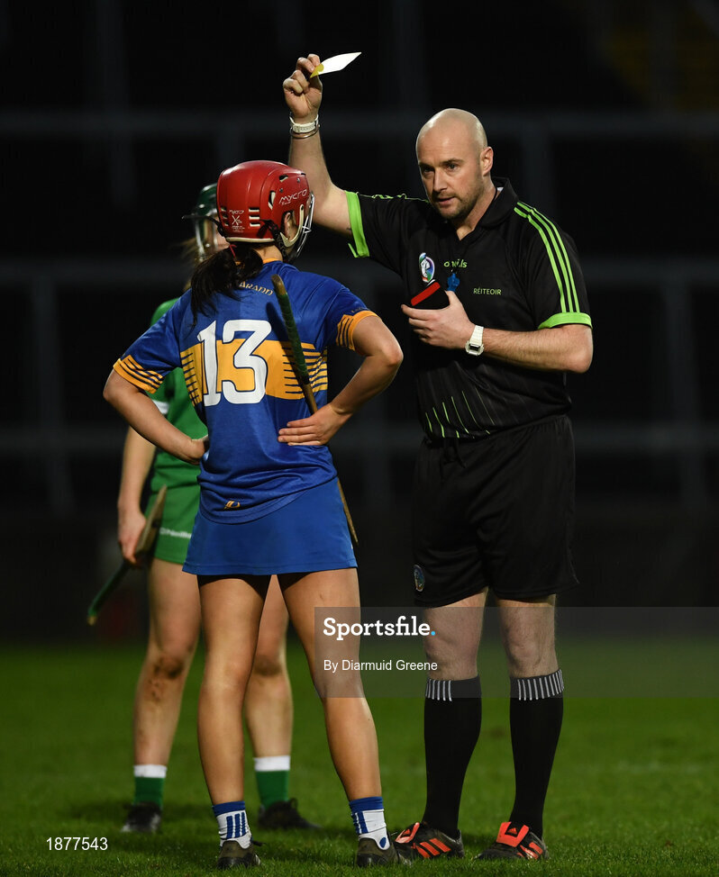 2 February 2020; Referee Andrew Larkin issues a yellow card to Karin Blair of Tipperary during the Littlewoods Ireland National Camogie League Division 1 match between Limerick and Tipperary at LIT Gaelic Grounds in Limerick. Photo by Diarmuid Greene/Sportsfile