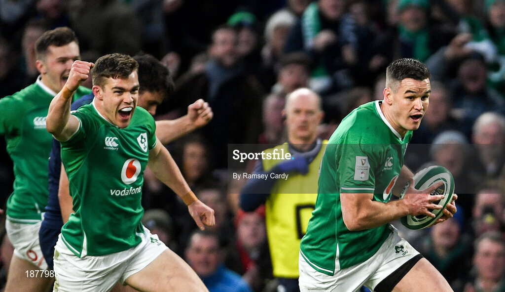 1 February 2020; Jonathan Sexton of Ireland runs in to score his side's first try during the Guinness Six Nations Rugby Championship match between Ireland and Scotland at the Aviva Stadium in Dublin. Photo by Ramsey Cardy/Sportsfile