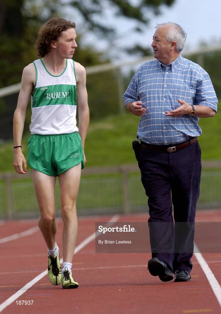 24 August 2005; Richie Yeates, 5000m/10,000m, who received a scholarship to Providence College, Rhode Island, New York, in conversation with Irish Runner editor Frank Greally. Morton Stadium, Santry, Dublin. Picture credit; Brian Lawless / SPORTSFILE