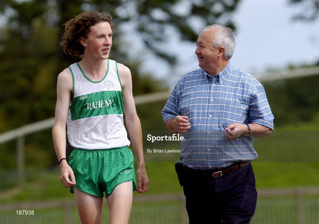 24 August 2005; Richie Yeates, 5000m/10,000m, who received a scholarship to Providence College, Rhode Island, New York, in conversation with Irish Runner editor Frank Greally. Morton Stadium, Santry, Dublin. Picture credit; Brian Lawless / SPORTSFILE