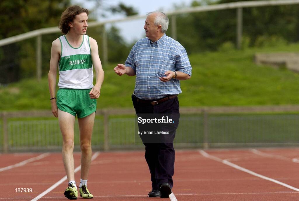 24 August 2005; Richie Yeates, 5000m/10,000m, who received a scholarship to Providence College, Rhode Island, New York, in conversation with Irish Runner editor Frank Greally. Morton Stadium, Santry, Dublin. Picture credit; Brian Lawless / SPORTSFILE