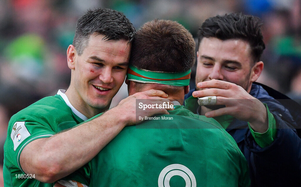 8 February 2020; Ireland captain Jonathan Sexton, left, and Robbie Henshaw, right, celebrate with team-mate CJ Stander after the Guinness Six Nations Rugby Championship match between Ireland and Wales at Aviva Stadium in Dublin. Photo by Brendan Moran/Sportsfile