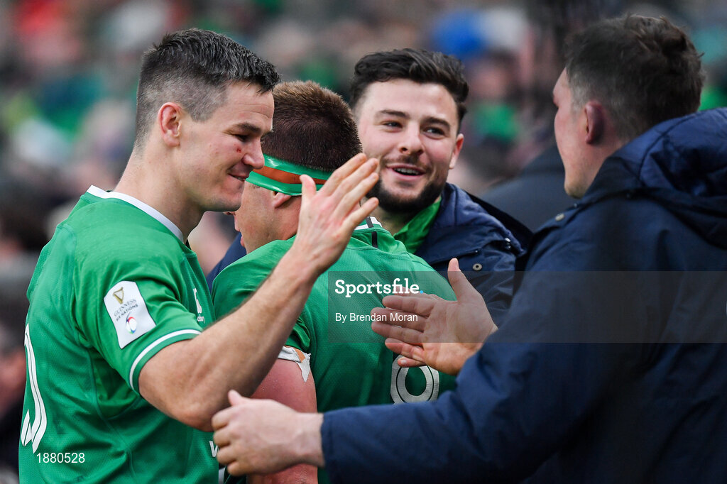 8 February 2020; Ireland captain Jonathan Sexton, left, celebrates with team-mate Peter O'Mahony after the Guinness Six Nations Rugby Championship match between Ireland and Wales at Aviva Stadium in Dublin. Photo by Brendan Moran/Sportsfile