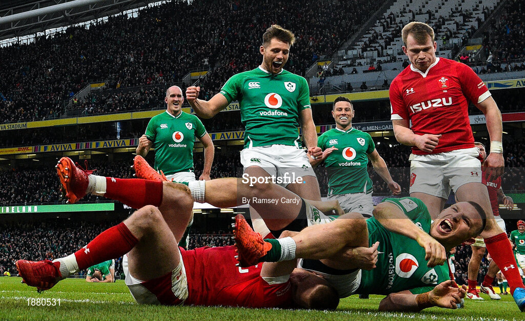 8 February 2020; Andrew Conway of Ireland celebrates with team-mate Ross Byrne, above, after scoring his side's fourth try during the Guinness Six Nations Rugby Championship match between Ireland and Wales at the Aviva Stadium in Dublin. Photo by Ramsey Cardy/Sportsfile