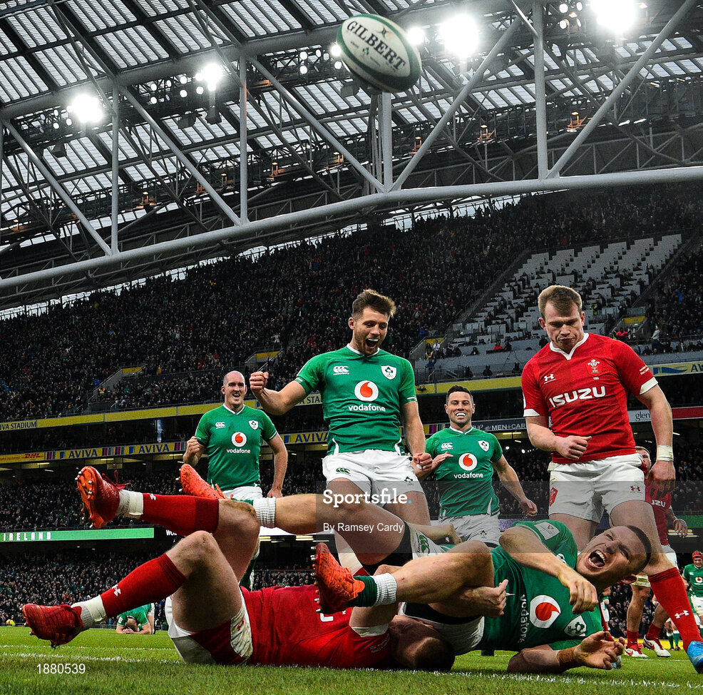 8 February 2020; Andrew Conway of Ireland celebrates with team-mate Ross Byrne , above, after scoring his side's fourth try during the Guinness Six Nations Rugby Championship match between Ireland and Wales at the Aviva Stadium in Dublin. Photo by Ramsey Cardy/Sportsfile