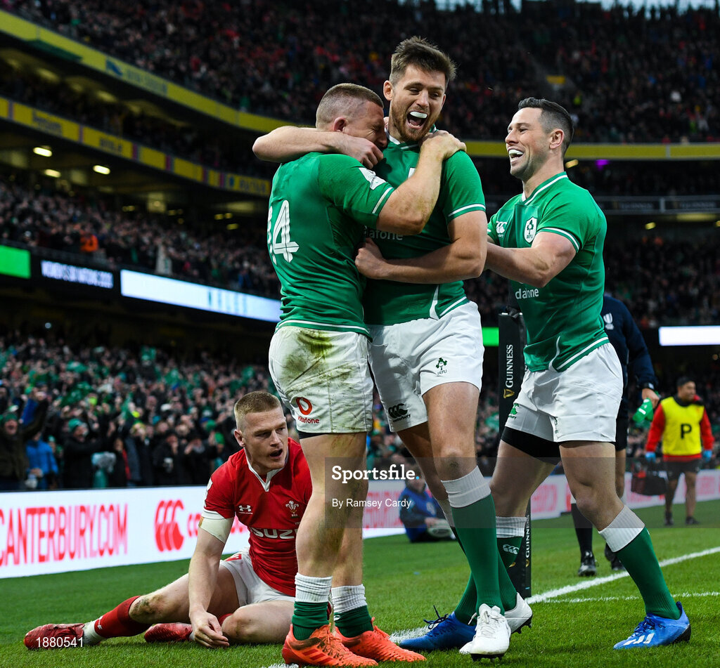 8 February 2020; Andrew Conway of Ireland celebrates with team-mate Ross Byrne, centre, and John Cooney, right. after scoring his side's fourth try during the Guinness Six Nations Rugby Championship match between Ireland and Wales at the Aviva Stadium in Dublin. Photo by Ramsey Cardy/Sportsfile