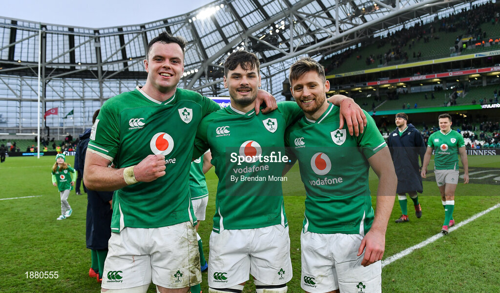 8 February 2020; Ireland players, from left, James Ryan, Max Deegan and Ross Byrne after the Guinness Six Nations Rugby Championship match between Ireland and Wales at Aviva Stadium in Dublin. Photo by Brendan Moran/Sportsfile