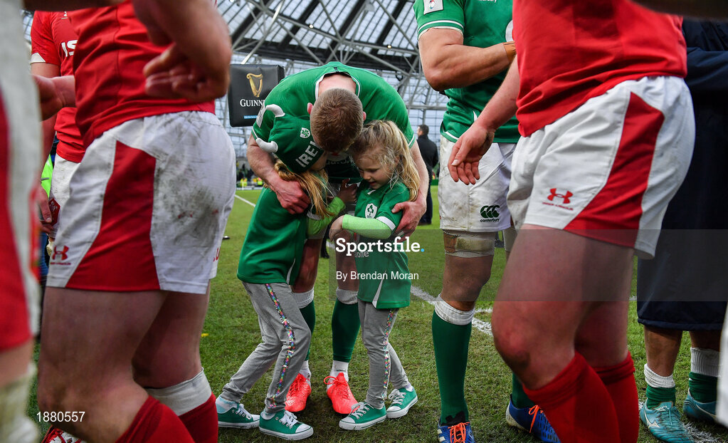 8 February 2020; Keith Earls of Ireland with his daughters Ella May and Laurie after the Guinness Six Nations Rugby Championship match between Ireland and Wales at Aviva Stadium in Dublin. Photo by Brendan Moran/Sportsfile