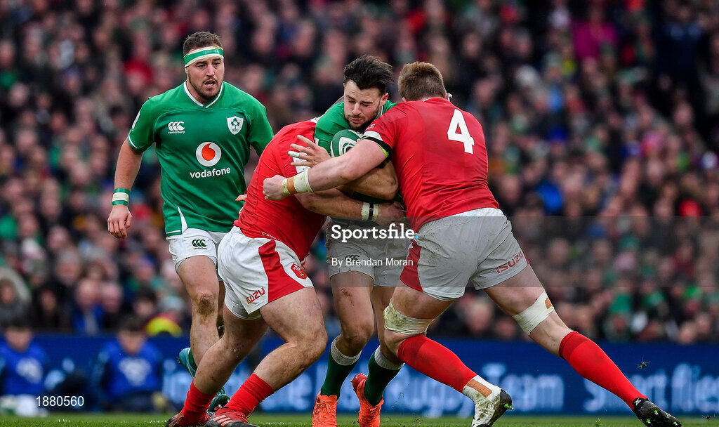 8 February 2020; Robbie Henshaw of Ireland is tackled by Dillon Lewis and Jake Ball of Wales during the Guinness Six Nations Rugby Championship match between Ireland and Wales at Aviva Stadium in Dublin. Photo by Brendan Moran/Sportsfile
