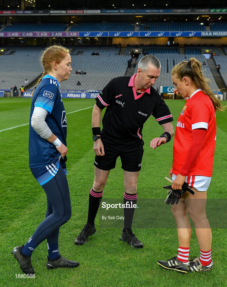 8 February 2020; Referee Niall McCormack with team captains Ciara Trant of Dublin, left, and Aisling Hutchings of Cork prior to the Lidl Ladies National Football League Division 1 Round 3 match between Dublin and Cork at Croke Park in Dublin. Photo by Seb Daly/Sportsfile