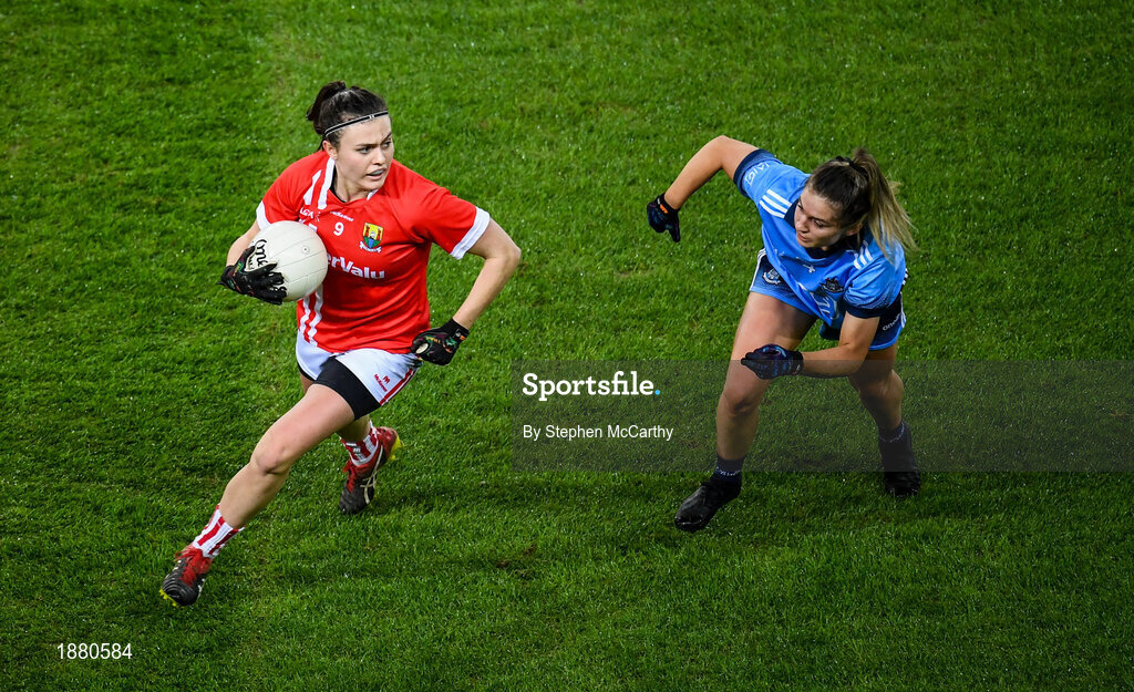 8 February 2020; Hannah Looney of Cork in action against Hannah O'Neill of Dublin during the Lidl Ladies National Football League Division 1 Round 3 match between Dublin and Cork at Croke Park in Dublin. Photo by Stephen McCarthy/Sportsfile