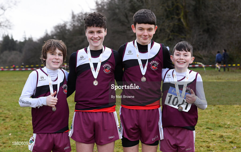 8 February 2020; Members of the Fergus AC, Clare, under-14 relay team, from left Ewan Wragg, Michael Kelly, Daire Culligan and Diarmuid McMahon, who came third, during the Irish Life Health National Intermediate, Master, Juvenile B & Relays Cross Country at Avondale in Rathdrum, Co Wicklow. Photo by Matt Browne/Sportsfile