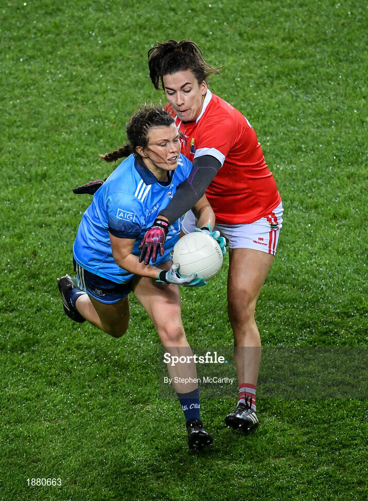 8 February 2020; Leah Caffrey of Dublin in action against Bríd O'Sullivan of Cork during the Lidl Ladies National Football League Division 1 Round 3 match between Dublin and Cork at Croke Park in Dublin. Photo by Stephen McCarthy/Sportsfile