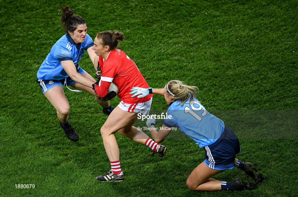 8 February 2020; Aisling Hutchings of Cork in action against Niamh Collins, left, and Niamh Sweeney of Dublin during the Lidl Ladies National Football League Division 1 Round 3 match between Dublin and Cork at Croke Park in Dublin. Photo by Stephen McCarthy/Sportsfile