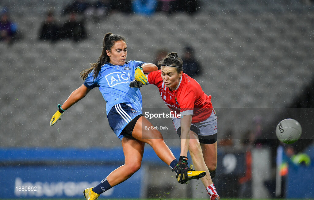 8 February 2020; Hannah O'Neill of Dublin in action against Hannah Looney of Cork during the Lidl Ladies National Football League Division 1 Round 3 match between Dublin and Cork at Croke Park in Dublin. Photo by Seb Daly/Sportsfile