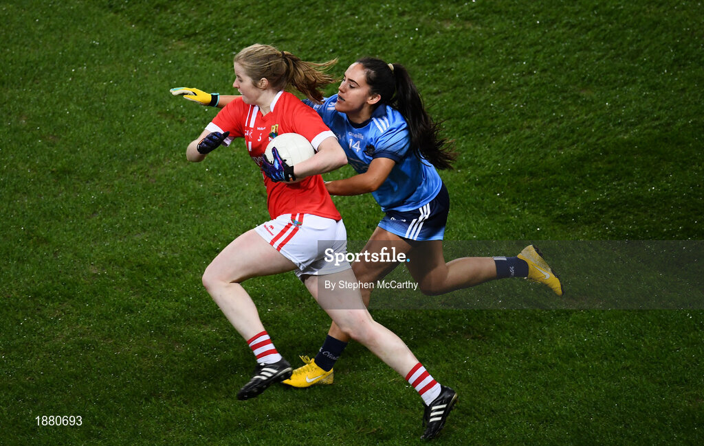 8 February 2020; Róisín Phelan of Cork in action against Hannah O'Neill of Dublin during the Lidl Ladies National Football League Division 1 Round 3 match between Dublin and Cork at Croke Park in Dublin. Photo by Stephen McCarthy/Sportsfile