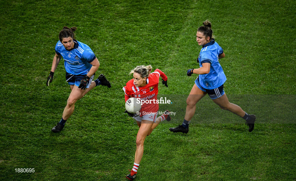 8 February 2020; Orla Finn of Cork in action against Niamh Collins, left, and Martha Byrne of Dublin during the Lidl Ladies National Football League Division 1 Round 3 match between Dublin and Cork at Croke Park in Dublin. Photo by Stephen McCarthy/Sportsfile