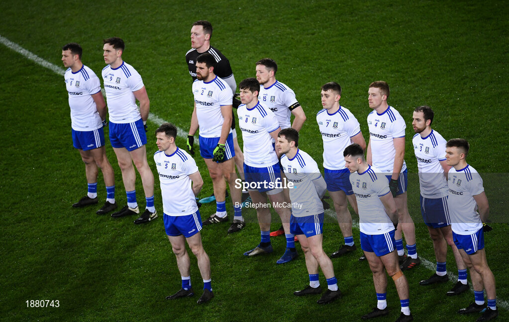 8 February 2020; Monaghan players stand for the National Anthem during the Allianz Football League Division 1 Round 3 match between Dublin and Monaghan at Croke Park in Dublin. Photo by Stephen McCarthy/Sportsfile