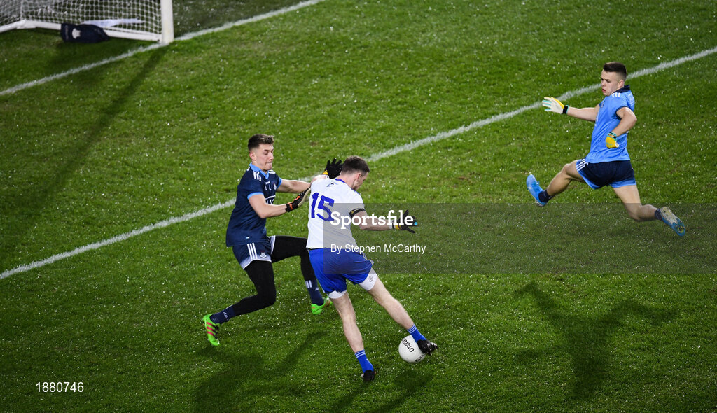 8 February 2020; Conor McManus of Monaghan shoots to score his side's first goal past Dublin goalkeeper Evan Comerford during the Allianz Football League Division 1 Round 3 match between Dublin and Monaghan at Croke Park in Dublin. Photo by Stephen McCarthy/Sportsfile