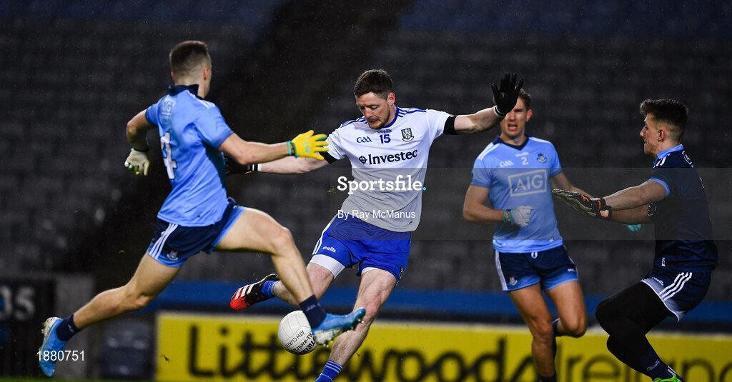 8 February 2020; Conor McManus of Monaghan shoots past Eoin Murchan, left, and Evan Comerford in the Dublin goal to score his side's first goal in the first minute of the Allianz Football League Division 1 Round 3 match between Dublin and Monaghan at Croke Park in Dublin. Photo by Ray McManus/Sportsfile