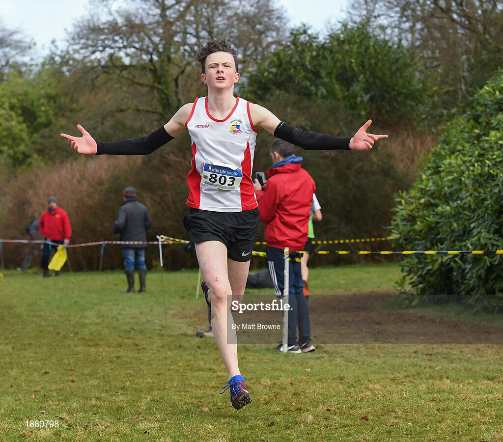 8 February 2020; Paul Delahunty of Greystones and Districy AC, Wicklow, celebrates after winning the Boys under-17 Cross Country during the Irish Life Health National Intermediate, Master, Juvenile B & Relays Cross Country at Avondale in Rathdrum, Co Wicklow. Photo by Matt Browne/Sportsfile