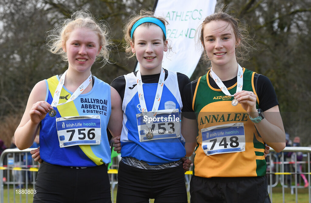 8 February 2020; Leah Toher, centre, from Claremorris AC, Mayo, who won gold in the girls under-17 Cross Country with second place Niamh McDonald, left, from Ballyroan Abbeyleix and District AC, Laois, and third place Kate McCrystal, from Annalee AC, Cavan, during the Irish Life Health National Intermediate, Master, Juvenile B & Relays Cross Country at Avondale in Rathdrum, Co Wicklow. Photo by Matt Browne/Sportsfile