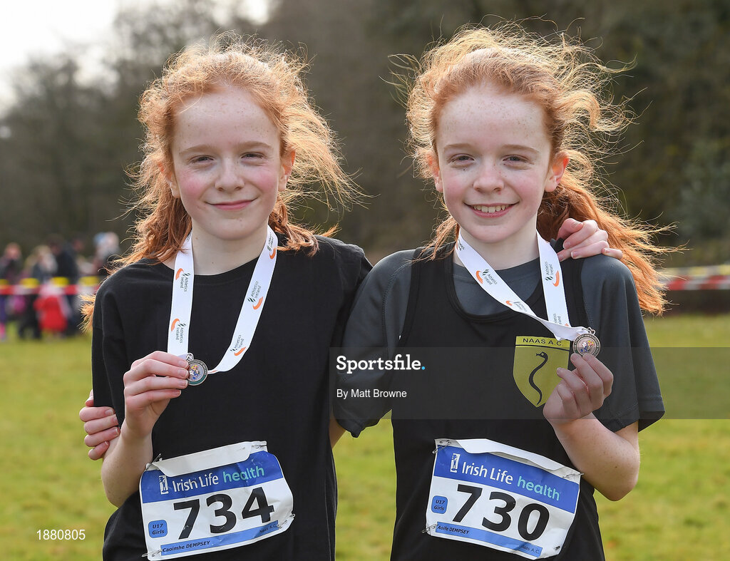 8 February 2020; Twins Caoimhe, left, and Aoife Dempsey of Naas AC, Kildare, who came fifth and sixth in the girls under-17 Cross Country during the Irish Life Health National Intermediate, Master, Juvenile B & Relays Cross Country at Avondale in Rathdrum, Co Wicklow. Photo by Matt Browne/Sportsfile