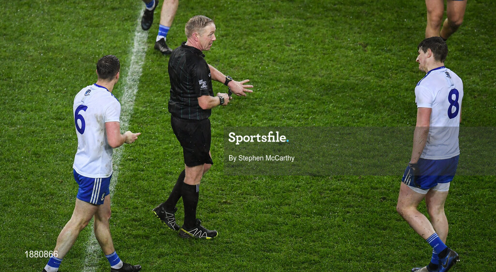 8 February 2020; Referee Ciaran Branagan shows his watch to Darren Hughes of Monaghan following the Allianz Football League Division 1 Round 3 match between Dublin and Monaghan at Croke Park in Dublin. Photo by Stephen McCarthy/Sportsfile