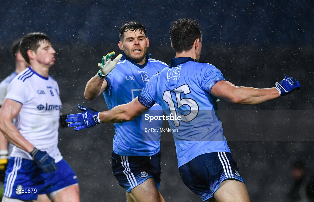 8 February 2020; Kevin McManamon celebrates with Dean Rock of Dublin after scoring a goal, in the 70th minute, during the Allianz Football League Division 1 Round 3 match between Dublin and Monaghan at Croke Park in Dublin. Photo by Ray McManus/Sportsfile