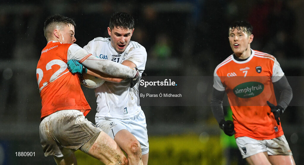 8 February 2020; David Hyland of Kildare in action against Aidan Nugent, left, and Joe McElroy of Armagh during the Allianz Football League Division 2 Round 3 match between Armagh and Kildare at Athletic Grounds in Armagh. Photo by Piaras Ó Mídheach/Sportsfile