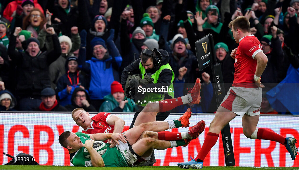 8 February 2020; Andrew Conway of Ireland celebrates after scoring his side's fourth try despite the tackle of Johnny McNicholl of Wales during the Guinness Six Nations Rugby Championship match between Ireland and Wales at Aviva Stadium in Dublin. Photo by Brendan Moran/Sportsfile