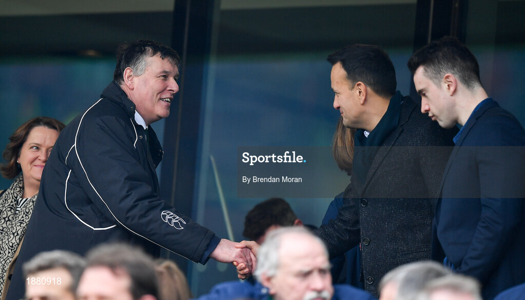 8 February 2020; IRFU Chief Executive Philip Browne welcomes An Taoiseach Leo Varadkar T.D., prior to the Guinness Six Nations Rugby Championship match between Ireland and Wales at Aviva Stadium in Dublin. Photo by Brendan Moran/Sportsfile