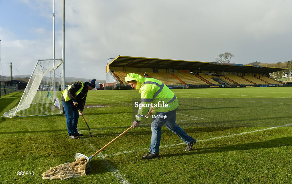 9 February 2020; St Eunan's club officials Andy McGlynn, right, and John Kilgallon working on the pitch before the Allianz Football League Division 1 Round 3 match between Donegal and Galway at O'Donnell Park in Letterkenny, Donegal. Photo by Oliver McVeigh/Sportsfile