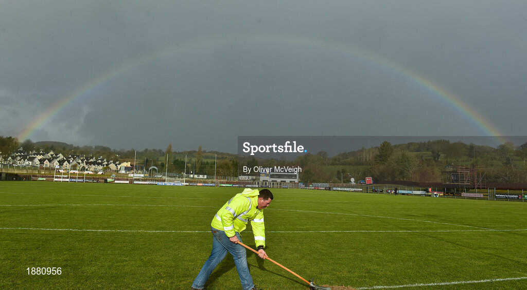 9 February 2020; St Eunan's club official Andy McGlynn clears water off of the pitch, with a rainbow in the distance, before the Allianz Football League Division 1 Round 3 match between Donegal and Galway at O'Donnell Park in Letterkenny, Donegal. Photo by Oliver McVeigh/Sportsfile