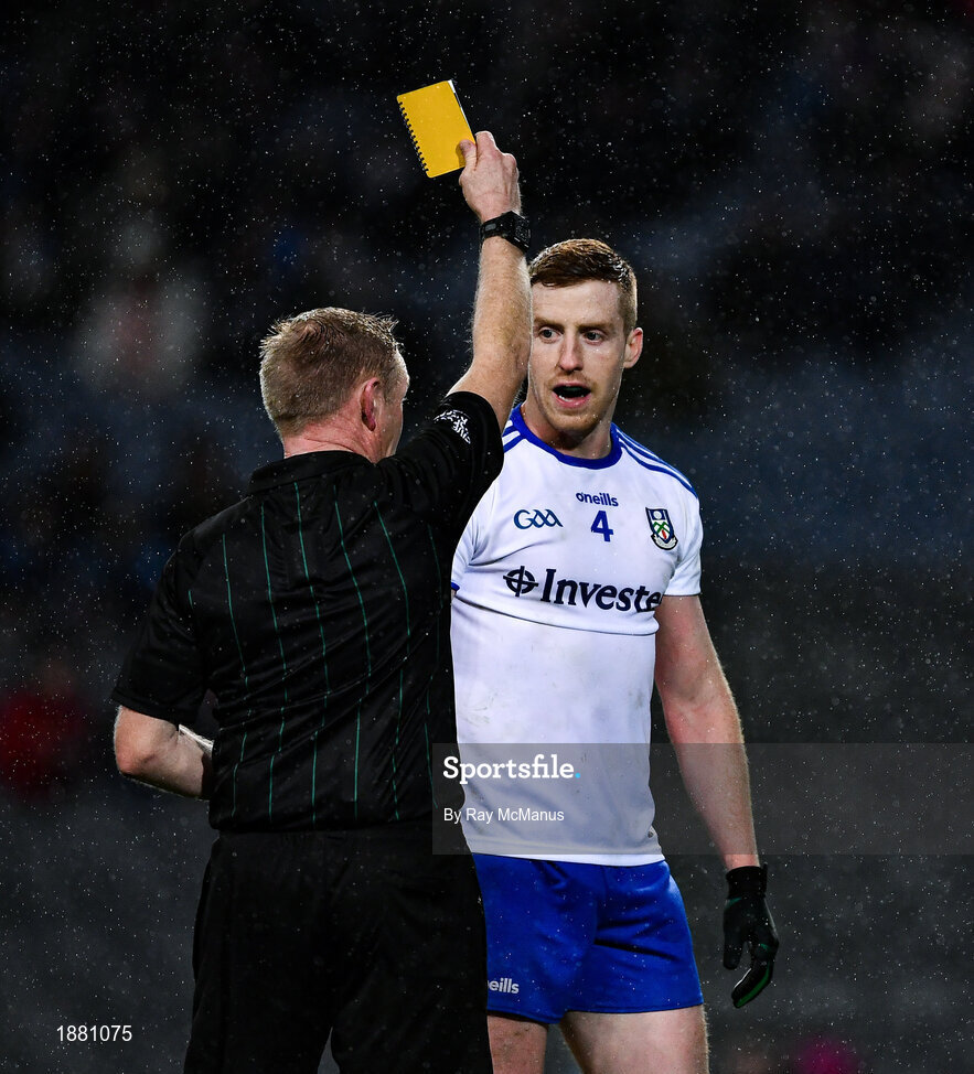 8 February 2020; Referee Ciaran Branagan issues a yellow card to Kieran Duffy of Monaghan before starting the second half of the Allianz Football League Division 1 Round 3 match between Dublin and Monaghan at Croke Park in Dublin. Photo by Ray McManus/Sportsfile