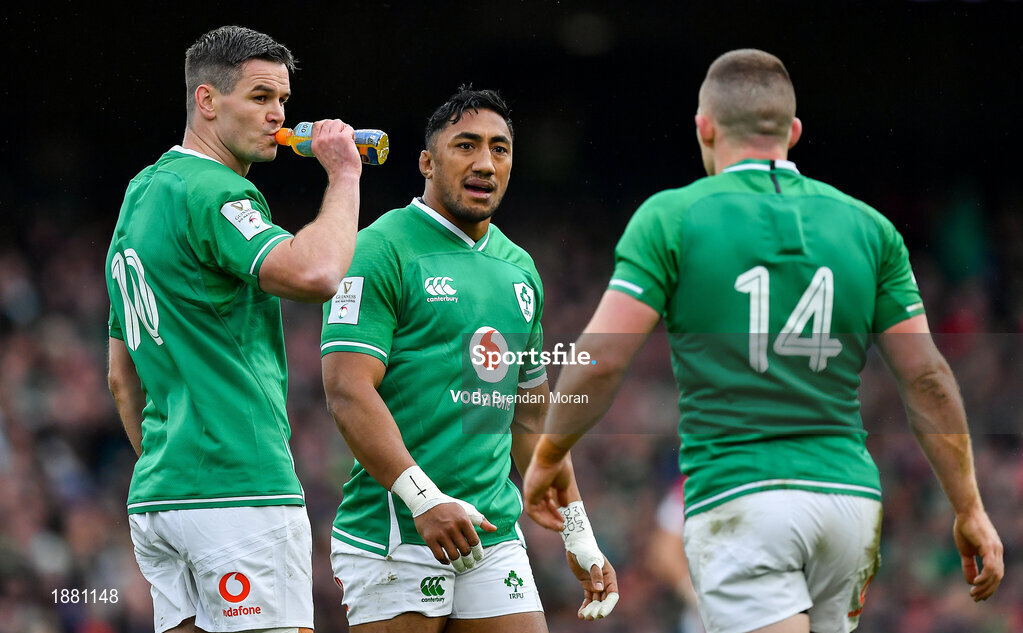 8 February 2020; Ireland players, from left, Jonathan Sexton, Bundee Aki and Andrew Conway during the Guinness Six Nations Rugby Championship match between Ireland and Wales at Aviva Stadium in Dublin. Photo by Brendan Moran/Sportsfile